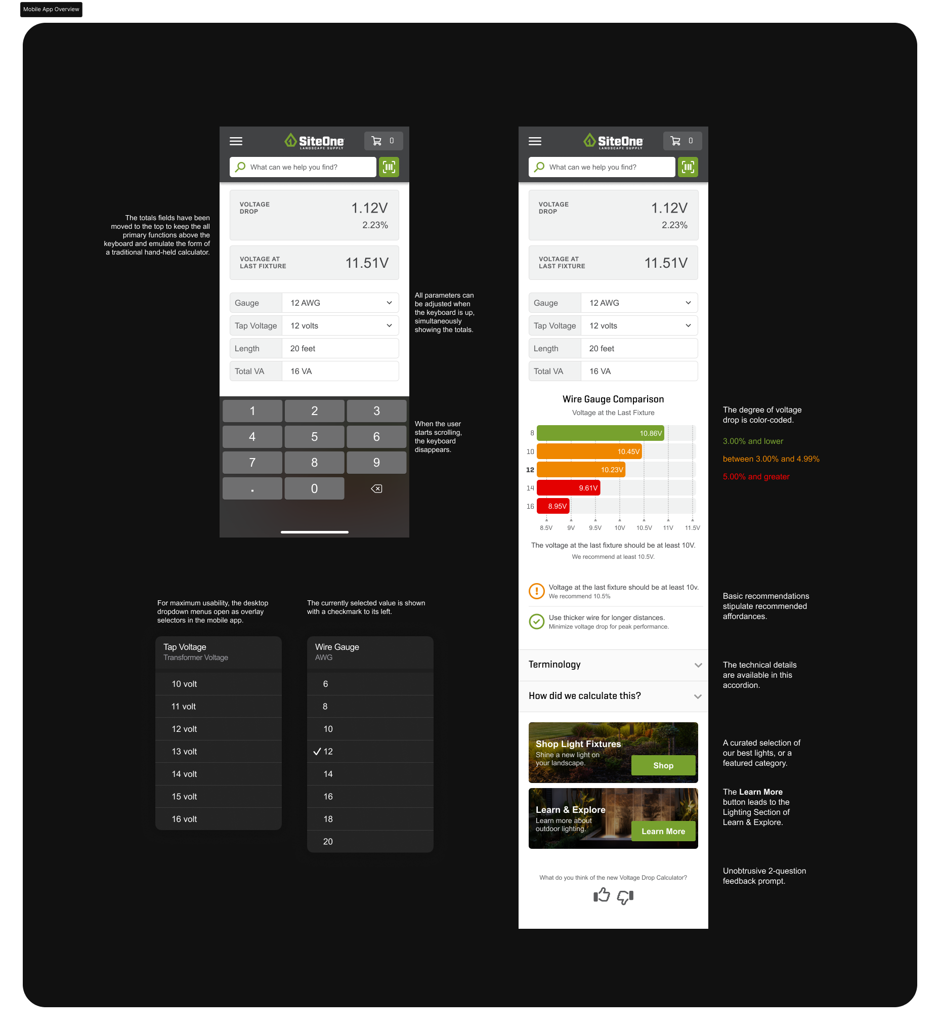 I blended UI design, UX strategy, technical research, and intuitive data visualization into one cohesive interface to create a powerful tool that helps landscape lighting professionals determine the requirements of their lighting projects.
